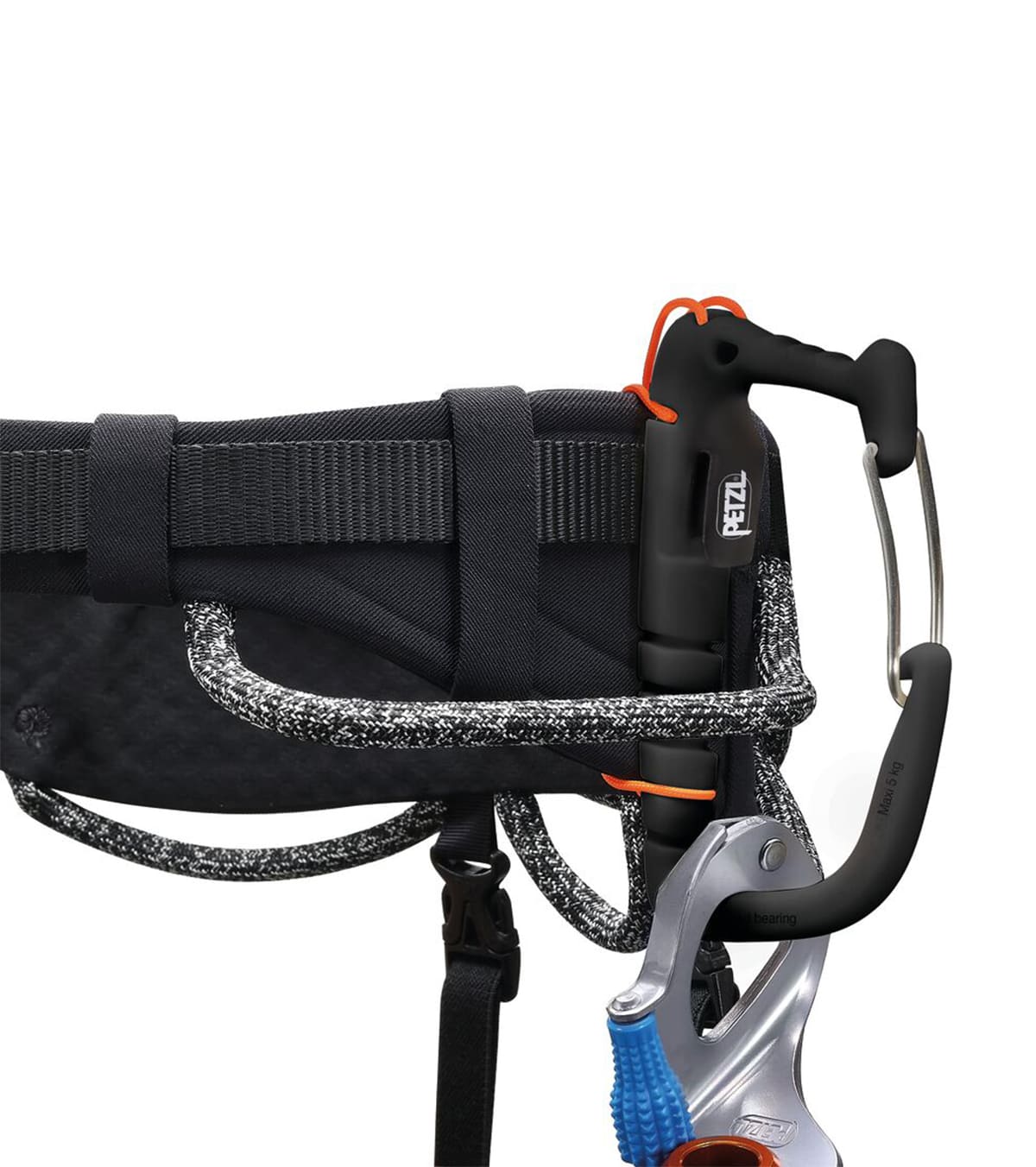 Fabricado con acero inoxidable y polímeros reforzados, pesa 40 g. Importante: no es un EPI; está diseñado únicamente para portar material, con una carga máxima de 5 kg.